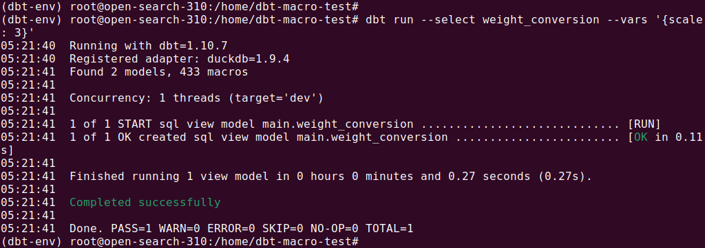 - CLI execution using run-operation: Macros that don’t fit naturally into models—such as utility functions for seeding data, cleaning up schemas, or altering database configurations—can be executed directly via the command line using the dbt run-operation command: