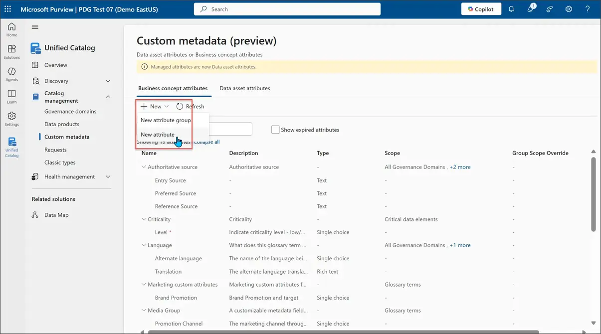Standardize usage across domains. Ensure business concept types (e.g., governance domains, products) and data asset types share consistent attribute definitions. This helps stewards and consumers interpret metadata without confusion. Review attribute usage periodically and retire those that provide little value. Metadata should evolve alongside governance practices, not remain static.